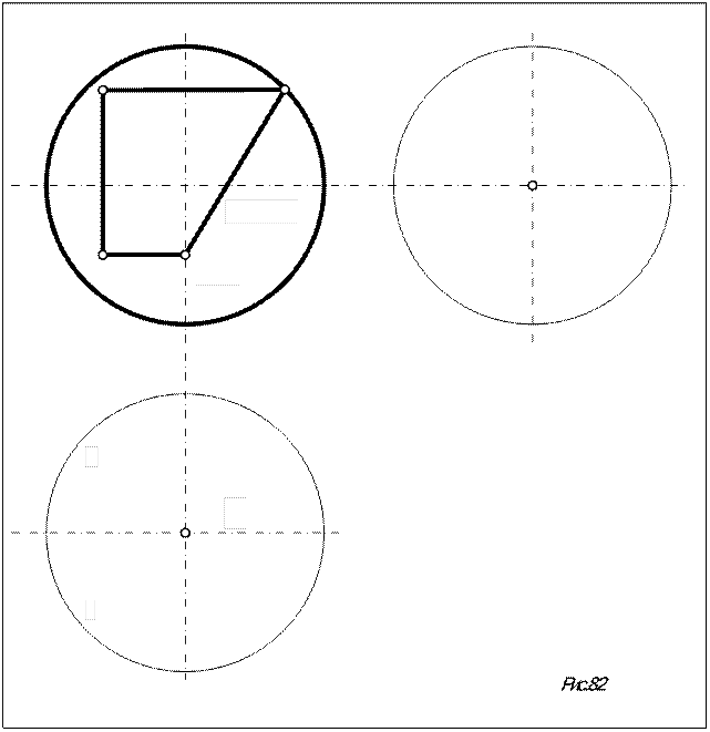 Т.к. грани призмы фронтально проецирующие, то на П2 проекция ЛП совпадает с проекцией призматического выреза. 2. Находим особые точки ЛП сначала на известной фронтальной проекции: -вершины ломаной – точки пересечения ребер n и m c поверхностью конуса - совпадают с проекциями самих ребер, т.к. ребра – фронтально проецирующие: n2 = 12 =22, m2 = 32 =42. -центр О (О2) и точки на концах осей эллипса. Продлив грань S (S2) до пересечения с очерковой образующей S2 B2 находим фронтальную проекцию большой оси эллипса 52 62, разделив которую пополам находим центр О (О2) и точки 72= 82 на концах малой оси. - граничные точки видимости находим как результат пересечения вырожденных про-екций граней призматического отверстия с очерковыми образующими конуса: граничные точки видимости на П2 – 52 = S2А2 П3 – 92 = S2 C2 На остальных проекциях найденные на П2 точки находим либо по их принадлежности образующим, на которых они расположены, либо по их принадлежности конусу. Например, точки 7 и 8 находим, проведя параллель радиуса r. При этом для достижения требуемой точности построений не рекомендуется пользоваться постоянной чертежа к0 и ломаными линиями связи между П1 и П3 (см. задачу на рис.77). 3. Случайные точки (на дуге эллипса) выбираем произвольно на П2, а другие их проекции находим по принадлежности поверхности конуса, как точки 7, 8. 4. Построенные точки соединяем с учетом их видимости на проекциях, определяя види-мость по представлению. При взгляде сверху ЛП видима полностью, не видны только ребра m и n отверстия. На П2 видимые и невидимые части ЛП совпадают. При взгляде слева (на П3) видимы части ЛП, лежащие на левой половине конуса, а также участки прямых (13) и (24) из-за отсутствия материала, их закрывающего. Задача. Построить проекции сферы с призматическим вырезом (рис.82). Алгоритм решения 1. Определяем тип линии пересечения (ЛП). Т.к. поверхность сферы пересекает поверх-ность призматического отверстия полностью, то данный случай - проницание (а точнее – граничный случай, т.к. одно из ребер призмы не пересекает, а касается сферы) и ЛП состоит из одной ломаной, звеньями которой являются дуги окружностей. Грани Г (Г2 ) и D (D 2 ) параллельны П1 и расположенные в них сечения сферы проециру-ются в П1 в натуральную величину в виде дуг окружностей, а в П3 — в виде горизонтальных отрезков. Грань S (S2 ) наклонена к П1 и П3 и дуга окружности, в ней расположенная, проеци-руется в эти плоскости проекций в виде дуг эллипса. Грань L (L2) параллельна П3 и располо-женное в ней сечение сферы проецируется в П3 в натуральную величину в виде дуг окружно-стей, а ви П2 — в виде отрезков. 2. Т.к. грани призмы фронтально проецирующие, то на П2 нам известна проекция ЛП: она совпадает с проекцией призматического выреза и мы можем отметить все особые точки ЛП: вершины 1, 2, 3, 4, граничные точки видимости на П1 (5, 6) и на П3 (4, 7), а также центр окружности О, расположенной в грани S (S2 ), и её горизонтальный диаметр 8-8 /. Проекции центра О2 и точек 82 и 82 / можно найти либо делением пополам диаметра 1-1*=11-11*, либо как результат пересечения вырожденной проекции грани S 2 с опущенным на неё из центра сферы О2* перпендикуляром. Т.к. три из четырёх граней призматического отверстия пересекают сферу по геометри-чески простым линиям (окружностям), которые в свою очередь проецируются в виде геомет-рически простых линий, то оптимальным алгоритмом решения является построен