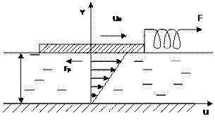 Механизм возникновения силы сопротивления можно представить следующим образом. Слой жидкости, прилегающей к пластинке, прилипает к ней и движется вместе с пластинкой со скоростью В рассматриваемом случае распределение скоростей линейное. Вследствие действия межмолекулярных связей между движущимися слоями жидкости возникает сила