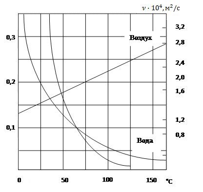Рис. 1.3. Зависимость кинематического коэффициента вязкости воды машинного масла и воздуха от температуры