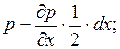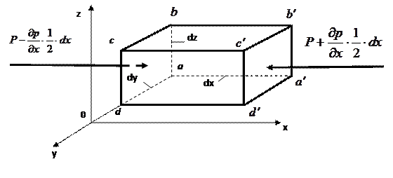 Рассматриваемый параллелепипед находится в равновесии под действием: а) массовых сил; б) поверхностных сил давления окружающей жидкости. Пусть p – гидростатическое давление в центре параллелепипеда. Тогда, учитывая непрерывность изменения давления в жидкости и пренебрегая величинами бесконечно малыми, стремящимися к нулю при уменьшении параллелепипеда до размеров точки, определим среднее гидростатическое давление на соответствующих гранях параллелепипеда из выражений: для грани abcd
