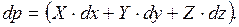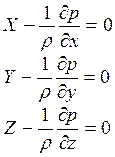 Проекции на оси x, y и z равнодействующей массовых сил, приходящихся на единицу массы жидкости (равных ускорению массовых сил), обозначим X, Y и Z. Тогда условие равновесия сил действующих на выделенный параллелепипед в проекции на ось x запишем в виде