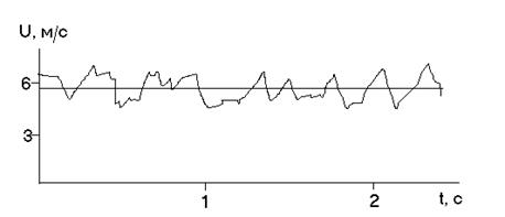 Таким образом, средняя скорость при ламинарном течении жидкости в трубе равна половине максимальной. Из вышеизложенного следует, что при ламинарном движении полученные теоретические решения для труб с различными поперечными сечениями блестяще совпадают с результатами опытов. Для турбулентного же движения, наиболее часто встречающегося в практике, чисто теоретического решения не существует и все формулы и закономерности получены либо непосредственно из опыта либо имеют полуэмпирический характер. Это объясняется исключительной сложностью структуры турбулентного потока, внутренний механизм которого до сих пор полностью не изучен. При изучении кинематики потока основным элементом является поле скоростей. Анализ многочисленных опытных данных указывает на необходимость особо учитывать при изучении турбулентного движения на изменение скорости в отдельных точках с течением времени. Такое изучение позволяет обнаружить важную особенность турбулентного потока. Тогда как для установившегося ламинарного потока характерно постоянство скорости в рассматриваемой точке потока, турбулентный поток отличается быстрыми изменениями местной скорости в ту или иную сторону от некоторого её среднего значения. Иными словами местные скорости не сохраняются постоянными даже в случае, когда течение происходит с постоянным во времени расходом. Таким образом, установившегося движения жидкости в его строгом понимании в турбулентном потоке не существует. Если замерить в точке изменение скорости во времени чувствительным прибором – термогидрометром (с осцилографом), то получим следующую картину, представленную на рис. 12.3. Как видно, скорость в турбулентном потоке в отличие от ламинарного подвержена изменениям во времени или, иначе говоря, отличается пульсацией. При этом важно, что, несмотря на кажущуюся беспорядочность изменений скорости, осреднённое значение её за достаточно длительный промежуток времени остаётся постоянным.