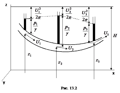 Для каждого сечения элементарной струйки величина H может быть представлена совокупностью отрезков Соединив между собой концы отрезков H, получим кривую или плоскость, называемые плоскостью или линией полного напора. Соединив кривой концы отрезков Итак, рис. 13.2 даёт геометрическое изображение уравнения Бернулли. Можно видеть, как по длине струйки меняются слагаемые уравнения. Если сечение расширяется, то уменьшается скоростной напор, но возрастает Если рассматривать уравнение Бернулли как уравнение энергии, то каждое слагаемое этого уравнения следует рассматривать как составляющую полной энергии (потенциальную или кинетическую) и каждое из этих слагаемых должно измеряться в единицах работы. Составляющие уравнения имеют линейную размерность, и, чтобы перевести это уравнение в уравнение работы, надо умножить его на единицу силы. При умножении его на 1 Н уравнение не изменится, но размерность будет выражена в Легко видеть, что с энергетической точки зрения уравнение Бернулли показывает, что сумма потенциальной энергии (положения и давления) и кинетической энергии есть величина постоянная. Таким образом, уравнение Бернулли представляет собой физический закон сохранения механической энергии при движении идеальной жидкости.