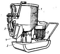 Турбулентный растворосмеситель (рис.3) представляет собой передвижную циклическую машину для приготовления растворов с осадкой по конусу СтройЦНИЛ не менее 7 см. Он состоит из смесительного бака 1 и основания 3, на котором установлен фланцевый электродвигатель 2. Бак 1 загружают исходными материалами через воронкообразную крышку. Ротор при этом должен вращаться. Объем загружаемой порции составляет 80 л. При открытом затворе 5 готовая смесь выгружается через люк 4. Ротор приводится в действие от электродвигателя через клиноременную передачу и, вращаясь, лопатками отбрасывает смесь к конусной части бака. Для торможения кругового движения смеси и образования спиральных потоков в баке на его вертикальной стенке установлены две пластины, которые поднимают смесь вверх, оттуда она падает на ротор и вновь вовлекается в движение по спирали, интенсивно перемешиваясь.