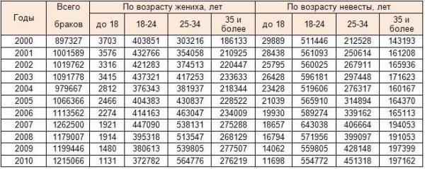 Причины ранних браков следующие: - Сильное чувство любви и желание поскорее воссоединится со своим партнером. Такие аргументы, как отсутствие жилья и финансовой защиты на влюбленных просто не действуют. Серьезно задуматься о том, что за собой влекут ранние браки, «за» и «против» они просто не способны. - Стремление узаконить свои интимные отношения. В некоторых семьях родители строго подходят к вопросу интимной жизни своих детей и чрезмерно их контролируют, от чего взрослые дети удовлетворить свое банальное любопытство могут только «легализировав» свои отношения. - Статистика ранних браков называет беременность самой распространенной причиной. Молодому человеку приходится либо брать ответственность за будущую семью на себя, либо оплатить аборт. - Желание освободится от чрезмерной родительской опеки. Случается это обычно в семьях, где родители манипулируют, контролируют или мало считаются с мнением своих детей, в результате чего последние стремятся поскорее вырваться из родительского дома. - Несчастная любовь. Очень часто новые отношения приходят на помощь, когда сердце разбито и хочется забыть прошлый опыт, снова почувствовать себя любимым человеком или просто насолить обидчику. Конечно же, последствия ранних браков, в основном, плачевные. Но ведь есть и счастливые примеры семейной жизни, когда супруги мирно живут вместе, учатся, строят свою профессиональную карьеру, растят детей и, при этом, у них все хорошо и прекрасно. Как правило, наибольшее количество девушек вступает в брак в возрасте 18-24 лет, а мужчины – в возрасте 25-34 лет. Статистика ранних браков такова: за 2010 год в России всего было заключено 1215066 браков, из которых в возрасте до 18 лет – 1131 браков (среди мужчин) и 11698 (среди женщин). Приятно то, что за последние 5 лет число ранних браков значительно снизилось: если в период с 2001 по 2005 год в возрасте до 18 лет в среднем регистрировалось 3117 браков в год (среди мужчин) и 25026 браков (среди женщин), то с 2006 по 2010 год таких браков в среднем было зарегистрировано 1744 и 16128 соответственно. И все-таки, проблема ранних браков остается. Итак, ранние браки: «за» и «против». Плюсы ранних браков: 1. Свадьба. Об этом волшебном дне, в котором много гостей, подарков и цветов, особенно мечтают девушки. Им не терпится побыть в белом платье и хотя бы на один день превратиться в сказочную принцессу; 2. Опять же сильные чувства, что позволяет влюбленным проявлять заботу и внимание друг ко другу, с легкостью прощая ошибки; 3. Нормальная нервная система. Молодому организму легче переносить все стрессы и бороться с трудностями, в том числе и семейными; 4. Супружество помогает повзрослеть психологически и стать более самостоятельным, потому что появляется ответственность не только за себя, но и за жену и детей; 5. Свобода действий. Этот аспект привлекает тех, кто поскорее хочет убежать от родительской опеки и, наконец-то, самостоятельно принимать решения; 6. В молодом возрасте характер и привычки еще не устоялись и более гибкие. Притираясь к друг другу, супруги совместно формируют традиции и устои своей семьи; 7. Работа. Некоторые работодатели считают, что если мужчина женат, то он ответственнее будет относиться к поставленным задачам. К сожалению, девушки, выйдя замуж, оказываются в менее выгодном положении, поскольку компании не хотят оплачивать декретный от