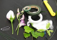 Флористическая техника - это способ работы с материалом, его видоизменение. Выделяют: Натуральные стебли. Чаще используется для букетов. Искусственные стебли или Техника тейпирования (здесь мастер-класс по тейпированной бутоньоркеСамая основная техника - тейпирование. Без нее свадебный флорист не сделает украшения для заказчиков. Мастер-класс бутоньерки: Материал: роза, булавка для броши, тейпы и анкор, листики, берграсс и проволока, атласная лента. 1. Подготовим булавку: проволочную шпильку проденем в дырочки, зажмем инструментом и с обмотаем зеленым тейпом. (Заготовки хранились для заказов) 2.Один из способов укрепления розы для бутоньерки. На проволоке загнем петлю, проденем через бутон, петля спрячется во внутрь бутона. Делается так для того, чтобы не отвалился бутон во время свадьбы. Но срез кладем маленький кусочек ваты, смоченный в растворе хризала, цветок предварительно должен быть отпоен в этом растворе 5-12 часов. ! Относительно ваты не срезе существует мнение, что вата со временем перестает питать бутон и только вытягивает влагу из цветка. Поэтому в некоторых школах делают бутоньерки без ваты или мягкой бумаги на срезе. 3. Заматываем анкором для большей герметичности, потом зеленым тейпом поверх. 4. Складываем листики вместе, от большого к меньшему, скалываем их степлером, потом ставим на проволоку. 5. Соединяем вместе бутон, булавку и листики. Смотрим, чтобы булавка плотно прилегала к бутону и не была выше цветка. 6. Добавим дуги из бергасса, зафиксируйте тейпом, с другой стороны декорируем листиком, сложенным пополам. Скобы прикрываем маленькими листиками, приклейте их клеем оазис к основным. 7. Обматываем белым тейпом для следующего декора атласной лентой поверху. Начинаем укладывать ленту с конца стебля, потом подклеим горячим клеем у бутона. Иногда оборачиваю бульонкой поверх ленты для надежности. Некоторые оставляют только зеленый тейп на бутоньерке или черный. Я декорирую всегда атласной лентой в цвет бутона. Готово! Делаю бутоньерки за 30-40 минут до времени заказа. Если отдаю на ночь заказ, даю порошок-консервант, чтобы поставить в раствор на ночь. Достать за 1 час до выхода и промокнуть ленту салфеткой. Еще вариант крепления булавки к стеблю, менее фиксирует бутон, но здесь, в Америке, делают так. Булавка для бутоньерки от оазис. Раньше я ее использовала, потом перестала. Во-первых, она дорогая (была 0.75 долл за штуку, брать надо было только коробку 50 шт), во-вторых, она расстегивается, были плохие отзывы от клиентов. Булавки для брошей очень дешевые, имеют поворотную головку, т.е. расстегнуть бутоньерку можно только принудительно!).