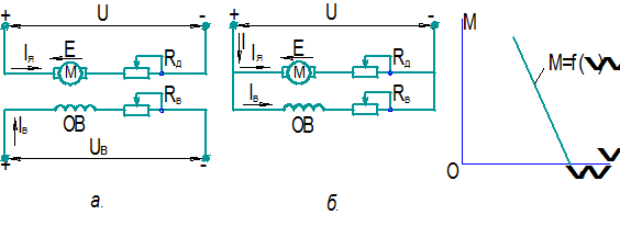 Схемы включения двигателя постоянного тока независимого и параллельного возбуждения представлены на рис.2.1. При независимом возбуждении (рис.2.1а) обмотка якоря двигателя М и обмотка возбуждения ОВ питаются от разных, независимых друг от друга источников напряжения U и U в , а при параллельном возбуждении (рис.2.1б) - от одного и того же источника U. На практике чаще всего используется схема с параллельным возбуждением. Аналитическое выражение механической характеристики двигателя можно получить из уравнения равновесия напряжений, составленного для якорной цепи по схеме рис.2.1а. При установившимся режиме работы двигателя (магнитный поток возбуждения и угловая скорость якоря постоянны) приложенное напряжение U уравновешивается падением напряжения в якорной цепи IЯR и электродвижущей силой(ЭДС) Е, наведенной в якоре в процессе его вращения, т.е.