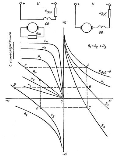 Рис. 1. Схемы включения и механические характеристики двигателя постоянного тока с последовательным возбуждением