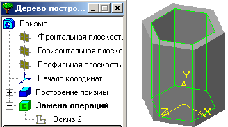 Рисунок 3.18 Рисунок 3.19 Операция Вырезание призмы отменена, что и отмечено в дереве построения. Редактирование по отмене операции Вырезание конуса выполним по другой схеме, совместив её с операцией вырезания горизонтально проецирующей шестигранной призмы. Дальнейший алгоритм построения модели заключается в следующем.