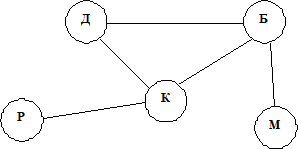 Это не карта местности. Здесь не выдержаны направления по сторонам света, не соблюден масштаб. На этой схеме отражен лишь факт существования пяти поселков и дорожной связи между ними. Такая схема называется графом. Граф отображает элементный состав системы и структуру связей.Составными частями графа являются вершины и ребра. Здесь вершины изображены кружками – это элементы системы, а ребра изображены линиями – это связи (отношения) между элементами. Глядя на этот граф легко понять структуру дорожной системы в данной местности. Построенный граф позволяет, например, ответить на вопрос: через какие поселки надо проехать, чтобы добраться из Репкино в Мышкино. Видно, что есть два возможных пути; обозначим их так: 1) Р – К – Б – М 2) Р – К – Д – Б – М Очевидно, первый путь более выгодный, потому что он короче. Однако, если по какой-то причине дорога между К и Б окажется не проезжей (идут ремонтные работы или занесло снегом), то единственным остается второй путь. Граф на рис.3.4 еще называют сетью. Для сети характерна возможность множества различных путей перемещения по ребрам между некоторыми парами вершин. Для сетей также характерно наличие замкнутых путей, которые называются циклами. На рис.2 имеется цикл: К – Д – Б – К. Кстати, термин «дорожная сеть» используется и в разговорной речи. И чем такая сеть гуще, тем лучше для сообщения, поскольку появляется множество различных вариантов проезда. Граф, изображенный на рис.2, является неориентированным графом. На нем каждое ребро обозначает наличие дорожной связи между двумя пунктами. Но дорожная связь действует одинаково в обе стороны: если по дороге можно проехать от Б к М, то по ней же можно проехать и от М к Б. Такую связь еще называют симметричной.