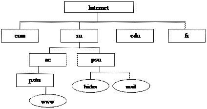 В этом дереве от корня отходят домены первого уровня, затем второго и т.д. Овалами изображены компьютеры. Адрес компьютера (читается справа налево) включает в себя последовательность доменов, начиная с первого уровня, и кончая именем компьютера. Для трех указанных на рис.3.10 компьютеров доменные адреса записываются так: www.pstu.ac.ru hidra.psu.ru mail.psu.ru