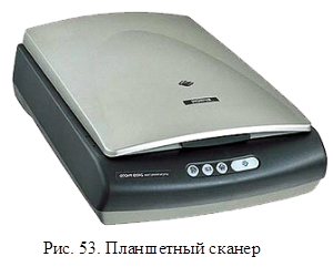 Мультимедийные гарнитуры используются для проведения видеоконференций, в интернет-телефонии, при интерактивном обучении. Сканер (рис. 53) предназначен для ввода в компьютер текстовой и графической информации. Сканеры характеризуются разрешающей способностью, количеством воспринимаемых оттенков, возможностью ввода цветных изображений, быстродействием, размером обрабатываемых изображений, стоимостью. Аналогично копировальному устройству сканер освещает оригинал, а светочувствительный датчик сканера с определенной частотой производит замеры интенсивности отраженного оригиналом света. Разрешающая способность сканера прямо пропорциональна частоте замеров. В процессе сканирования устройство выполняет преобразование величины интенсивности светового потока в двоичный код, который передается в компьютер для дальнейшей обработки. По конструктивному исполнению сканеры бывают настольными и портативными (ручными). К настольным сканерам можно отнести планшетные, барабанные, сканеры микроформ и сканеры трехмерных объектов. Планшетный сканер представляет собой высококачественное устройство, обеспечивающее сканирование плоских изображений с высоким разрешением. Барабанный сканер работает со сгибаемыми, отражающими и прозрачными объектами. Сканер микроформ предназначен для считывания изображения с микрофиш и микрофильмов. Сканер трехмерных объектов обеспечивает считывание цифровых контурных изображений трехмерных объектов.
