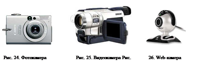 К данным устройствам ввода информации можно отнести цифровые фотокамеры (рис. 24), цифровые видеокамеры (рис. 25) и web-камеры (рис. 26). Устройства применяются в системах компьютерного зрения, в системах распознавания образов, для съемки и последующей компьютерной обработки статических и видеоизображений. Цифровые фотокамеры и видеокамеры в отличие от традиционных фотоаппаратов и видеокамер сохраняют изображение не на пленке, а на машиночитаемом носителе, например на флэш-карте, не требуют оцифровки изображений. Монитор Основным устройством вывода информации в ПК является монитор. Поскольку работа на персональном компьютере предполагает постоянное «общение» с монитором, важно уметь правильно оценить и выбрать монитор, а также правильно расположить рабочее место пользователя. Характеристики мониторов условно можно разделить на две группы: технические и эргономические, однако их влияние друг на друга очевидно. К техническим характеристикам относятся: - размер пискела (элемента изображения на экране); - количество отображаемых цветов; - размер экрана; - разрешающая способность; - кадровая частота; - кривизна экрана; - принцип формирования изображения. Изображение на экране складывается из отдельных элементов, называемых элементами изображения (picture element), или пикселами (pixel). Размер каждого пиксела определяет качество изображения в целом. Чем меньше пиксел, тем более четким будет изображение на экране монитора. У большинства современных мониторов размер пиксела варьирует в диапазоне 0, 2 – 0, 27 мм. По количеству отображаемых цветов мониторы делятся на монохромные (одноцветные), которые обеспечивают вывод изображения на экран только в черно-белом режиме, и цветные. В монохромном мониторе каждый пиксел на экране отображается одной точкой. В цветном мониторе для отображения одного пиксела используются три точки экрана, светящиеся с различной яркостью одним из «базовых» цветов: RGB (Red–красный, Green–зеленый и Blue–синий). Размеры отдельных точек очень малы, а расположены они очень близко друг к другу, поэтому для глаза пользователя сливаются в один пиксел, цвет которого определяется комбинацией оттенков точек базовых цветов. Размером пиксела для цветных мониторов является расстояние между одноцветными точками на экране. Цвет каждой точки кодируется в двоичной системе счисления и записывается в память видеоадаптера. Чем больше места для описания цвета каждого пиксела отводится в памяти, тем больше количество цветов, выводимых на экран монитора (глубина цветности). Современные мониторы способны выводить изображение на экран с использованием сотен миллионов цветов и оттенков. Это параметр является комплексным, т.е. зависит не только от характеристик монитора, но и от характеристик видеоадаптера. Размер экрана монитора определяется, как и для телевизора, длиной диагонали, которую принято выражать в дюймах (”). Чем больше диагональ монитора, тем качественнее изображение, формируемое на экране монитора, и тем дальше от монитора может располагаться пользователь. Однако с ростом диагонали повышается и цена монитора. Для современных мониторов стандартом является диагональ 17”, выпускаются мониторы с диагональю 19”, 20”, 21”, 29”, 33”, 37” и 38”. Разрешающая способность монитора определяется количеством пикселов, отображаемых на экране. 