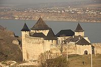 Хотинська фортеця (рум. Cetatea Hotinului) — фортеця 13 — 18 століття у місті Хотин, що у Чернівецькій області, Україна. Сьогодні на території фортеці розташований Державний історико-архітектурний заповідник «Хотинська фортеця». Одне з семи чудес України. Хотинська фортеця веде свій початок від Хотинського форту, що був створений у 10 столітті князем Володимиром Святославичем як одне із порубіжних укріплень південного заходу Русі, у зв'язку з приєднанням до неї буковинськихземель. Форт, який згодом було перебудовано у фортецю, знаходився на важливих транспортних шляхах, що з'єднувалиКиїв із Пониззям, пізнішим Поділлям, і Придунав'ям. Укріплення було споруджено на кам'янистому мисі, утвореному високим правим берегом Дністра і долиною впадаючої дрібної притоки. На початку воно являло собою замкнений земляний вал з дерев'яними стінами і оборонними спорудами. Завданням форту було оборона поселення Хотин і переправи через річку. Перша кам'яна фортеця була невеликою. Вона була розташована на самому мисі, там де сьогодні стоїть північна башта, і простягалася на південь до теперішнього комендантського палацу. Впродовж століть ця фортеця була таким собі «Феніксом», її неодноразово піддавали реконструкції та розширенню, вона потерпала і зазнавала руйнації від рук завойовників і знов відбудовувалася. Наприкінці 11 століття Хотин належав до Теребовлянського князівства. У 1140-х роках він перейшов до Галицкого, а з 1199року — Галицько-Волинського князівств. У 1250—1264 роках князь Данило Галицький і його син Лев, перебудовували фортецю. Навколо неї з'явилися семиметрова кам'яна стіна та рови шириною до 6 метрів. У північній частині фотреці звели нові невеликі укріплення. У другій половині 13 століття її перебудовували генуезці. В 1340-х роках Хотин увійшов до складу Угорського королівства, а з 1375 року вже перебував у складі Молдавського князівства. Молдавський володар воєвода Стефан III Великий значно розширив межі фортеці. Він особисто керував її реконструкцією. Було зведено прикрашений геометричними орнаментами мур шириною 5-6 і висотою 40 метрів, три башти, рівень двору фортеці піднімають на 10 метрів та розділяють на Княжий двір і двір Воїнів. Були вириті глибокі підвали, які служили приміщеннями для вояків. Саме після цієї реконструкції Хотинська фортеця практично повністю набула свого сьогоднішнього вигляду. Упродовж 14 — 16 століть вона була резиденцією молдавських господарів.