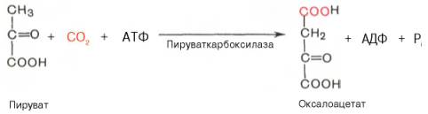 1 - пируваткарбоксилаза; 2 - малатдегидрогеназа (митохондриальная); 3 -малатдегидрогеназа (цитоплазматическая); 4 - фосфоенолпируваткарбоксикиназа. Синтез фосфоенолпирувата осуществляется в несколько этапов. 1.(№10) Первоначально пируват проникает в митохондрии, под влиянием пируваткарбоксилазы и при участии СО2 и АТФ карбоксилируется с образованием оксалоацетата (ЩУК):