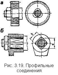В профильном соединении (рис. 3.19) охватывающая и охватываемая поверхности имеют некруглое сечение. Благодаря этому возможна передача крутящего момента без использования дополнительных деталей. По сравнению со шпоночными и шлицевыми соединениями профильное обладает меньшей концентрацией напряжений и лучшей центровкой деталей. Недостаток – в сложности изготовления профильной поверхности. Профильное соединение рассчитывают по напряжениям смятия на рабочих поверхностях. Для соединения «на квадрате» (рис. 3.19, б) принимают b» 0, 75d. Условие прочности: Scm = 3Т / (b2 ℓ) £ [Scm], (3.60) где ℓ – длина соединения, обычно ℓ = (1…2) d; b – ширина прямолинейной части грани; [sсм] = 100…140 МПа – допускаемое напряжение смятия для термообработанных поверхностей.