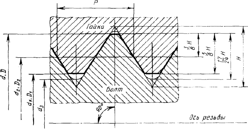 d - наружный диаметр наружной резьбы (болта); D - наружный диаметр внутренней резьбы (гайки); d2 - средний диаметр болта; D2 - средний диаметр гайки; d1 - внутренний диаметр болта; D1 - внутренний диаметр гайки; d3 - внутренний диаметр болта по дну впадины; Р - шаг резьбы; Н - высота исходного треугольника. Обозначения резьбы выглядит следующим образом: M5 – 6g M5 – 6h× 0.25 – шаг резьбы(если он отсутствует, то он максимальный для данного диаметра) M5 – 6gLH – левая резьба M5 – 6h× 3(P1) – резьба с несколькими заходами Условие прочности:
