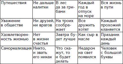 1. Материальный достаток. 2. Близкие отношения. 3. Состояние здоровья. 4. Стабильная работа. 5. Патриотизм. 6. Увлечения. 7. След в жизни. 8. Путешествия. 9. Уважение в обществе. 10. Удовлетворенность жизнью. 11. Самореализация.