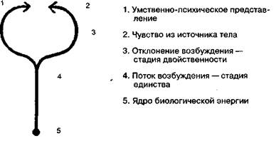 Биоэнергетический анализ подходит к личности и к человеческим проблемам с точки зрения тела и его функций. Появление такого подхода было обусловлено тенденцией западной культуры, которая приравнивала тело к плоти, а ум к духу. В результате ум рассматривался как высший аспект человеческого существования, в то время как телу отводилась низшая и второстепенная роль. Одной из причин такого отношения мог быть факт прямохождения, при котором голова возвышается над всем остальным телом. Но были и другие существенные причины. Человеческий мозг является уникальным явлением. Способность человека рассуждать и мыслить абстрактно все еще внушает нам благоговейный страх. Поэтому для человека казалось логичным отождествить свой ум с Богом. Познание было настолько важным для развития цивилизации, что, казалось, им можно было оправдать отрицание притязаний тела на равное внимание. Сейчас же мы обнаруживаем, что это было серьезной ошибкой. Хотя тело человека имеет такую же структуру, как и у других млекопитающих, оно все же уникально по многим важным параметрам. Человек является единственным животным, которое в вертикальном положении обладает совершенным равновесием благодаря укрупнению области таза. Вертикальная поза открыла самую уязвимую часть человеческого тела внешнему миру. Оказавшийся в таком положении человек будет больше осознавать свои нежные чувства и будет более способен выражать и получать любовь. Человеческая рука отличается не только обособленной постановкой большого пальца. Ее чувствительность и гибкость поистине поразительны. При наблюдении за игрой пианиста складывается впечатление, будто его руки двигаются сами по себе. Своим рукам человек обязан высокоразвитой функцией осязания, которая играет очень важную роль в познании реальности. Сейчас мы наблюдаем рост внимания к телу, и мы постепенно отходим от старого деления, которое рассматривало разум и тело как два отдельных и разных существа. Разум и тело идут рука об руку. Может ли разум существовать отдельно от тела или тело существовать само по себе? Ответ — нет. У греков есть хорошая пословица на этот счет: в здоровом теле — здоровый дух. Духовность человека не является функцией одного лишь его разума, но его целого существа. Чувство духовности, как и любое другое чувство, представляет собой телесное явление. Представление о духовности — психическое явление. Между ними можно провести такое же различие, которое я раньше провел между убеждением и верой. Тем не менее мы должны признать, что представление и чувство не всегда совпадают, разум и тело не всегда идут рука об руку на поверхностном уровне. Человек может задействовать разум в деятельности, которая не включает участие его тела. Таким же образом он может совершать телесные движения без ведома ума. Мы знаем, что сознание может напрямую воздействовать на тело и что тело может оказывать влияние на сознание. Примирение этих двух взглядов на взаимосвязь тела-разума, их внешней двойственности и лежащего в основе единства было достигнуто Райхом в его диалектической концепции, которая объясняет как противоположность, так и единство всех психосоматических явлений. Примирение этих явлений показано на следующей диалектической диаграмме (рис. 11).