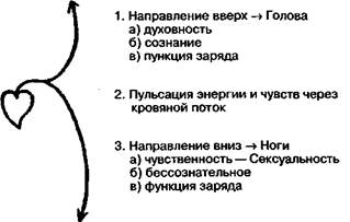 Рис. 16. Диалектическая диаграмма. В течение нескольких лет в моем кабинете висел плакат, изображающий поток чувств в теле. На одной стороне показаны виды чувств, появляющиеся в разных частях тела, когда поток возбуждения, исходящий из сердца, течет полно и свободно. Диаграмма носит схематический характер, но на ней я, насколько мог, максимально точно локализовал эти чувства. Когда отсутствуют какие-либо блоки, прерывающие поток, чувства имеют положительный знак или свойство. На другой стороне плаката изображены чувства, которые развиваются, когда поток блокируется хроническим мышечным напряжением. Прерывается не только сам поток, но и внутри каждой части образуется застой возбуждения, приводящий к образованию плохих чувств с отрицательным знаком. Для удобства и ясности я показал это различие с помощью двух отдельных схем. Линии, которые закручиваются вокруг себя, указывают на модели сдерживания и застоя (рис. 17 и 18).