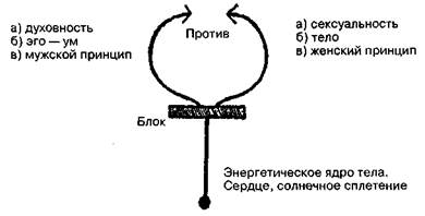 Рис. 14. Диаграмма тела. Если мы ощущаем, что наше тело разделено в срединной секции кольцом напряжения в области диафрагмы, то эти два полюса станут двумя противостоящими друг другу лагерями, а не противоположными концами единой пульсации, движущейся одновременно в обоих направлениях, или конечными точками амплитуды маятника, качающегося между ними. Сейчас уже можно признать тот факт, что некоторая степень диафрагмического напряжения присутствует у большинства людей. Я указывал на это раньше в связи с потерей ощущений в животе, в центре Хара, из-за отсутствия глубокого брюшного дыхания. Так же истинно и то, что некоторая степень «расщепления» свойственна большинству людей западного общества. Следствием такого расщепления или диссоциации двух частей тела стала утрата восприятия единства. Два противоположных направления одного потока превратились в две антагонистичные силы. Поэтому сексуальность будет переживаться как сила, представляющая опасность для духовности; точно таким же образом духовность будет обозначать отрицание сексуального удовольствия. В добавление к этому все другие антитетические парные силы функционирования рассматриваются как находящиеся в конфликте, а не в гармонии. Логика этого анализа становится более понятной, если мы еще раз посмотрим на эти две диаграммы, но уже с изображенным на них блоком, который показывает, где происходит прерывание потока возбуждения (рис. 15 и 16).
