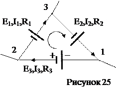 Рассмотрим контур, состоящий из трех участков (рисунок 25). Направление обхода по часовой стрелке примем за положительное, отметив, что выбор этого направления совершенно произволен. Все токи, совпадающие по направлению с направлением обхода контура, считаются положительными, не совпадающие с направлением обхода - отрицательными. Источники ЭДС считаются положительными, если они создают ток, направленный в сторону обхода контура. Затем применим к каждому из трех участков обобщенный закон Ома (см. (18.5)): I1 R1 = j2 - j3 - E1,