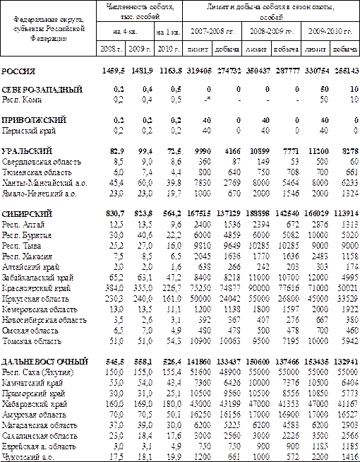Численность, лимит добычи и добыча соболя в России