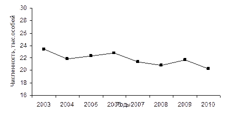 Основным методом мониторинга численности рыси в России является зимний маршрутный учет. Особенности биологии рыси позволяют с удовлетворительной точностью определять численность рыси этим методом в регионах, заселенных ею достаточно плотно. В остальных регионах (таких большинство) при определении численности, из-за небольшого количества материала (числа встреч следов), велика роль случайности. Поэтому для представления о реальной численности рыси следует принимать во внимание не только показатель, полученный в данном году, но и положение тренда многолетней динамики, а также параметры размножения рыси и обилие основных жертв. Последнее в случае рыси важно, поскольку, из-за редкости рыси число суточных троплений ее наследов невелико и вычислить достаточно точно пересчетный коэффициент, вносящий поправку на активность, сложно. Вследствие этого, в дополнение к данным ЗМУ следует принимать во внимание результаты опросов и, особенно, картирования всехсообщений о рыси с установлением участков обитания. В последние 30 лет в целом по России наблюдается устойчивое сокращение численности рыси. В 2010 г. ресурсы рыси оцениваются величиной порядка 20, 0-21, 0 тыс. особей (табл. 12), (рис. 12.1).