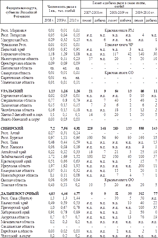 В Сибирском федеральном округе численность бобра на 2010 г.по нашим оценкам и сведениям из регионов определена в 80-85 тыс. особей. Официальное использование ресурсов находится на уровне 1-1, 5%. В Дальневосточном федеральном округе в Хабаровском крае и Камчатской области для уточнения результатов акклиматизации двух видов бобров необходимо проведение качественных учетных работ. В целом по России уровень использования бобра, по официальным данным, в сезоны 2007-2008 гг. и 2008-2009 гг. составлял 8–9 тыс. особей, что соответствует уровню добычи в сезоны 2003-2004 гг. – 2006-2007 гг. В сезоне 2009-2010 гг. по поступившим неполным официальным данным в России добыли 7696 бобров, около 1% от имеющегося ресурса. В связи с очень малой материальной заинтересованностью охотников в добывании бобров, из-за чрезмерно низких цен на его шкурки и проблем с их реализацией, официальный промысел бобра на большей части территории России практически отсутствует.
