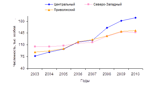 Рис. 13.2. Динамика численности бобра в Центральном, Северо-Западном и Приволжском федеральных округах