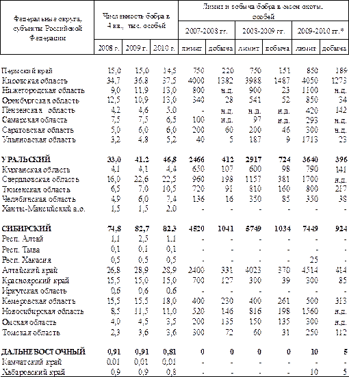 Численность выдры в целом по России достаточно стабильна. Легальное использование ресурсов выдры находится на очень низком уровне. По официальным данным в России в сезоны охоты 2007-2008 гг., 2008-2009 гг. и 2009-2010 гг. было добыто 390, 232, 282 выдры соответственно. Данные по добыче за последний сезон не полные. В среднем уровень добычи составляет около 0, 5% от имеющихся ресурсов этого вида. Фактическое количество добываемых выдр на территории России в несколько раз превышает данные из официальных источников. Официальная добыча выдры с использованием минимальных квот в значительной мере может способствовать сбору фактических материалов не только о количестве добытых зверей, но и о состоянии численности этого редкого, трудно учитываемого охотничьего вида в отдельных регионах и в целом по России. Таблица 14.