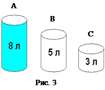 Решение. Выберем для исполнения составляемого алгоритма исполнителя Водолея. Дадим строгое описание Водолея: с чем работает Водолей, какие команды входят в его систему команд (СКИ). Водолей работает с тремя ёмкостями (8 л, 5 л, 3 л), обозначим ёмкости буквами А, В, С. Опишем команды, которые научим выполнять Водолея: перелей из А в В, перелей из А в С, перелей из В в А, перелей из В в С, перелей из С в А, перелей из С в В. Рассмотрим команду «перелей из А в В». Результат этой команды зависит от того, достаточно ли в ёмкости В места для всей воды из ёмкости А. Если да, то ёмкость А становится пустой, а в В оказывается столько воды, сколько было в А и В вместе до переливания. Если же места в В недостаточно, то В становится полной, а в А остается столько воды, сколько не поместилось в В. Аналогично выполняются Водолеем другие команды СКИ.