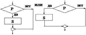 Доказано, что организовать действия в любой задаче можно, используя комбинации основных управляющих структур: функционального блока, условных структур, циклических структур. В приведенных ниже блок-схемах основных управляющих структур организации действий в алгоритмах приняты такие обозначения: P, P1, … – проверяемые условия (логические выражения); S, S1, S2, … – действия по обработке ин 1. Функциональный блок имеет вид: S может быть оператором, командой вызова с возвратом некоторой процедуры, другой управляющей структурой организации действий в алгоритме. 2. Условные структуры.