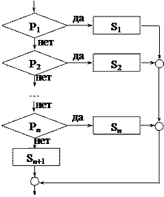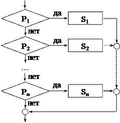 1. Выбор в неполной форме. По этой команде сначала проверяется условие P1. Если оно выполняется, то производятся действия, определяемые функциональным блоком S1 и далее оператор, следующий за командой выбора; если P1 ложно, то проверяется условие P2. Если условие P2 истинно, то производятся действия, определяемые функциональным блоком S2 и далее оператор, следующий за командой выбора; если P2 ложно, то проверяется условие P3 и т.д. до P n. Если P n выполняется, то производятся действия, определяемые функциональным блоком S n и далее оператор, следующий за командой выбора; если P n ложно, то команда выбора никаких действий не предписывает и сразу выполняется следующий за ней оператор.
