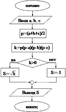 Задача 12. Площадь треугольника. Даны длины трех отрезков a, b, c. Если существует треугольник, сторонами которого являются данные отрезки, то вычислите его площадь S. Иначе переменной S присвойте значение «-1». Составьте блок-схему алгоритма решения поставленной задачи. Решение. Смотри блок-схему алгоритма (задача 12). Можно показать, что если p ∙ (p-a)∙ (p-b)∙ (p-c)> 0, то треугольник со сторонами a, b, c существует. Задача 13. Большее из трех чисел. Составьте блок-схему алгоритма нахождения большего из чисел a, b, c. Переменной max присвойте значение большего из трех чисел. Решение. Смотри блок-схему алгоритма (задача 13).