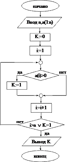 Очевидно, что функциональный блок S1 будет содержать циклическую структуру, например, структуру «repeat S until P». Подставив детализацию блока S1 (блок-схема 2 (задача 22)) в блок-схему 1 (задача 22), получим одну циклическую структуру внутри другой, вложенные циклы – блок-схема 3(задача 22). Задача 23. Положительные числа. Дана числовая последовательность a 1, a 2, …, an. Определите, есть ли среди ai, 1£ i £ n положительные числа, если да, то переменной K присвойте значение 1, в противном случае – значение 0. Составьте блок-схему алгоритма решения поставленной задачи. Решение. Смотри блок-схему алгоритма (задача 23).