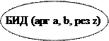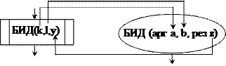 БИД – имя алгоритма (большее из двух). Ссылка на вспомогательный алгоритм в основном алгоритме осуществляется с помощью специальной команды вызова вспомогательного алгоритма, в которой указывается имя вспомогательного алгоритма и список фактических параметров, которые должны быть подставлены вместо формальных параметров при исполнении вспомогательного алгоритма. Команда вызова вспомогательного алгоритма имеет вид: < имя вспомогательного алгоритма> (< список фактических параметров>). На блок-схеме вызов вспомогательного алгоритма изобразим в виде геометрической фигуры Исполнение команды вызова вспомогательного алгоритма эквивалентно исполнению вспомогательного алгоритма с фактическими параметрами. Команда вызова вспомогательного алгоритма исполняется как один шаг основного алгоритма. Исполнение команды обращения к вспомогательному алгоритму разбивается на следующие этапы: 1. На время исполнения команды обращения к вспомогательному алгоритму выполнение основного алгоритма приостанавливается. 2. Формальным параметрам-аргументам вспомогательного алгоритма присваиваются значения фактических параметров, записанных в команде вызова вспомогательного алгоритма. 3. Исполняется вспомогательный алгоритм с полученными значениями аргументов. 4. Значения результатов-параметров вспомогательного алгоритма присваиваются соответствующим значениям параметров, записанных в команде вызова вспомогательного алгоритма. 5. Выполняется команда основного алгоритма, следующая за командой вызова вспомогательного алгоритма. Замечание: Значения данных вспомогательного алгоритма, не переданные в основной алгоритм после исполнения вспомогательного алгоритма, становятся недоступными. Количество, порядок, тип параметров в команде вызова вспомогательного алгоритма должны соответствовать количеству, порядку, типу параметров в заголовке вспомогательного алгоритма.