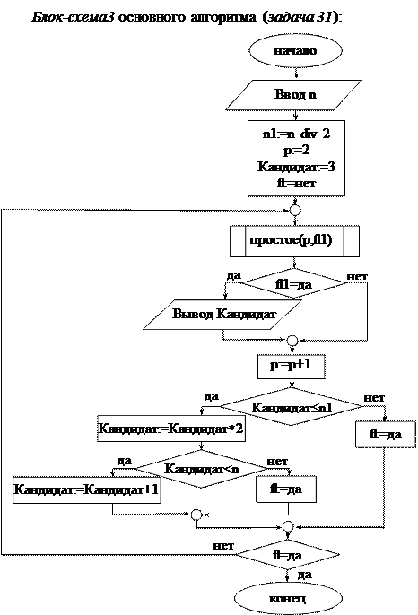 Задача 31. Числа Мерсенна. Числа вида 2 p -1, где p – простое число, называются числами Мерсенна[7]. Многие числа Мерсенна также являются простыми. Составьте алгоритм нахождения всех чисел Мерсенна, принадлежащих отрезку [2; n ]. Решение. Смотри блок-схемы 1-3 алгоритма (задача 31).