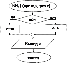 Часто при построении алгоритмов решения задач возникает необходимость организации в различных местах алгоритма одной и той же последовательности команд, которая выполняется каждый раз при различных наборах операндов. В таких случаях эти последовательности команд обычно оформляют специальным образом в виде вспомогательных (подчиненных) алгоритмов. А в главном (основном) алгоритме вместо этой последовательности команд записывают одну команду обращения к вспомогательному алгоритму. Алгоритмы, целиком включаемые в состав разрабатываемого алгоритма, называются вспомогательными (подчиненными). Использование вспомогательных алгоритмов при проектировании алгоритма решения поставленной задачи позволяет целенаправленно идти к решению задачи, использовать при решении разработанные ранее алгоритмы. Кроме того, это позволяет избежать при записи основного алгоритма повторения текста в тех его частях, которые описаны во вспомогательном алгоритме. Использование вспомогательных алгоритмов – средство экономии памяти компьютера: каждый вспомогательный алгоритм существует в одном экземпляре, в то время, как обращаться к нему можно многократно из разных точек программы. При вызове вспомогательного алгоритма активизируется последовательность образующих его операторов, а с помощью передаваемых вспомогательному алгоритму параметров, нужным образом модифицируется реализуемый в нем алгоритм. Использование вспомогательных алгоритмов вызывает необходимость оформлять их специальным образом, чтобы иметь возможность в дальнейшем ссылаться на них в основном алгоритме. Формальные способы оформления таких алгоритмов широко применяются в языках программирования, а сами вспомогательные алгоритмы, записанные на языках программирования, называют подпрограммами или процедурами. При использовании блок-схем полная формализация в оформлении вспомогательных алгоритмов, как правило, не производится. Однако, будем придерживаться некоторых принципов оформления. В заголовке вспомогательного алгоритма (блок «начало») за именем вспомогательного алгоритма будем указывать в круглых скобках список так называемых формальных параметров. В списке формальных параметров укажем имена входных и выходных данных (аргументов (арг) и результатов (рез)) алгоритма. Это необходимо для того, чтобы при ссылке на подчиненный алгоритм в основном алгоритме можно было задать значения аргументов, а после исполнения вспомогательного алгоритма, воспользоваться результатами – значениями соответствующих данных. Например, если алгоритм нахождения большего из двух чисел необходимо оформить как вспомогательный, где a и b – аргументы, а z – результат, то блок начала этого алгоритма оформим так: