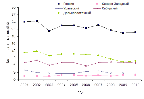 Рис 23. Динамика численности росомахи в федеральных округах и в целом по России