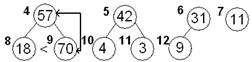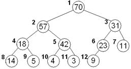 2.1. Mass =(70, 57, 31, 18, 42, 23, 11, 14, 5, 4, 3, 9). Меняем местами в пирамиде первый и последний элементы 9, 57, 31, 18, 42, 23, 11, 14, 5, 4, 3, 70 1 2 3 4 5 6 7 8 9 10 11 12 Усекаем справа последовательность на 1 элемент (он стоит на своем месте) 9, 57, 31, 18, 42, 23, 11, 14, 5, 4, 3 || 70 1 2 3 4 5 6 7 8 9 10 11 2.2. Просеиваем элемент Mass(1)=9 по своим потомкам 9, 57, 31, 18, 42, 23, 11, 14, 5, 4, 3