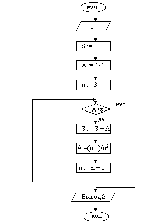 Вычислить при n > 2 сумму тех ее членов, которые больше заданного числа e. При решении задачи находится очередной член последовательно и, если он больше e, добавляется к сумме.