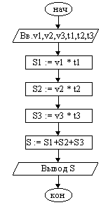 На схемах СЕРІЯ позначає один або кілька будь-яких операторів; УМОВА є логічне вираження (ЛВ) (якщо його значення ІСТИНА, перехід відбувається по галузі ТАК, інакше — по НЕМАЄ). На схемі циклу з параметром використані позначення: ПЦ — параметр циклу, НЗ — початкове значення параметра циклу, КЗ — кінцеве значення параметра циклу, Ш — крок зміни параметра циклу. Початок і кінець алгоритму на блок-схемах позначають овалом, що вводяться і виведеному перемінні записуються в паралелограмі. У прикладах ми будемо використовувати запис алгоритмів за допомогою блок-схем і словесний опис. Лінійні алгоритми Найпростіші задачі мають лінійний алгоритм рішення. Це означає, що він не містить перевірок умов і повторень. Приклад 1. Пішохід йшов по пересіченій місцевості. Його швидкість руху по рівнині v1 км/год, у гору — v2 км/год і під гору — v3 км/ч. Час руху відповідно t1, t2 і t3 ч. Який шлях пройшов пішохід?