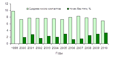 Анализ учетов включал в себя определение по районам и областям наиболее важных параметров: среднего количества контактов за тягу (увиденных и услышанных вальдшнепов), максимального количества контактов за тягу и доли точек, где тяги не наблюдалось. Ежегодное среднее по России количество самцов, зарегистрированных в мае-июне на вечерней тяге в течение двух часов, варьировало от 9, 1 до 11, 3 (на площадках) и от 6, 9 до 8, 1 (по данным всероссийских учетов). Изменения по годам более заметно прослеживались в отдельных регионах, что было связано с погодными условиями каждого конкретного сезона размножения. Некоторые результаты всероссийских учетов и учетов на площадках приведены на рис. 32.1 и 32.2. В целом численность тянущих самцов из года в год была стабильной, причем незначительные колебания интенсивности тяги за исследованный период по обоим методам учета (на площадках и всероссийскому) были синхронными. Несколько более высокие результаты учетов на площадках определяются тем, что во всероссийском учете используются данные из многих регионов, в т.ч. из тех, где численность гнездящихся вальдшнепов низка. По Европейской России наилучшие тяги были отмечены в 2001 и 2007 гг., наихудшие – в 2005 и 2010 гг. Однако, следует заметить, что ежегодно отмечаются довольно значительные различия по основным показателям тяги между регионами. За последние 3 года (2008 - 2010 гг.) несколько выросла доля точек, где тяги не отмечено. Однако, и этот процент (максимальный для всероссийского учета - 3, 3% в 2010 г.) является очень низким в сравнении с данными учетов на площадках.
