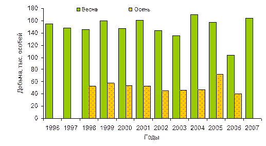 Доля точек без тяги на площадках была максимальной в 2000 г. (15, 3 %), но по сравнению с европейскими странами, это невысокий показатель. Например, во Франции наивысший процент точек, где отмечен хотя бы один тянущий вальдшнеп за вечер, за период с 2000 по 2007 гг. был в 2007 г. и составил 25, 4%, а в Эстонии из 46 точек только в 39, 1 % была отмечена тяга (Galli, Spano, Valker, 2007). В Великобритании из 900 точек тянущие вальдшнепы были обнаружены только в 43% (Hoodless и др., 2006). Это еще раз доказывает, что основное ядро гнездящегося европейского вальдшнепа приходится на Россию и в лесной зоне нашей страны большинство биотопов пригодны для гнездования вида. Данные наблюдений на тяге показывают, что численность гнездящегося вальдшнепа в России, в первом десятилетии нового века оставалась стабильной, даже несмотря на небольшое ее снижение в 2010 г., связанное с неблагоприятной зимовкой в Западной Европе. Добыча. Оценка добычи вальдшнепа основывалась на анализе официальных данных, поступавших по системе Департамента охоты РФ (Блохин и др., 2002). Ежегодно российские охотники добывали на тяге от 133 000 до 181 000 вальдшнепов. Исключение составил 2006 г., когда из-за угрозы птичьего гриппа весенняя охота была закрыта в большинстве регионов России и добыча составила чуть более 111 000 птиц. В другие годы наименьший объем добычи на тяге отмечен для 2003 г., что объясняется засухой предшествующего сезона размножения и плохими условиями зимовки в Европе в 2002/03 гг. Наибольшее количество вальдшнепов добыто в 2005 г. В целом же добыча вальдшнепа на тяге в России за исследуемый период была стабильна, но довольно сильно различалась по годам в ряде регионов. Прежде всего, это было связано со сроками весенней охоты (табл. 32.3, рис. 32.3) Учеты осенней добычи проводились двумя методами: анализом официальной статистики, поступавшей из регионов, и анкетированием охотников - владельцев легавых собак. По официальным материалам осенняя добыча вальдшнепа в России в 2000-х годах так же была достаточно стабильна. Лишь в 2005 г. резкое увеличение добычи произошло за счет южных регионов (табл.32.4). Всего по материалам учёта в России в 2000 – 2007 гг. добывалось ежегодно около 200 000 вальдшнепов, из которых 75% весной. Устойчивых тенденций снижения или роста добычи вальдшнепа не прослеживалось (Блохин и др., 2002, 2005). Отметим, что доля России в добыче вальдшнепа в Европе составляет всего 5 %.
