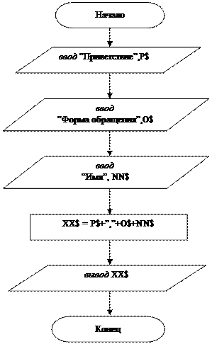 Рис. 1. Линейный алгоритм формирования и вывода приветствия.