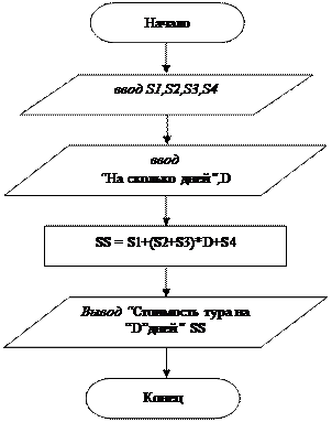 Рис. 2. Блок-схема алгоритма решения задачи 1. Программа: INPUT “Введите стоимости проезда, проживания, питания, страховки”, S1, S2, S3, S4 INPUT “На сколько дней”, D SS=S1+(S2+S3)*D+S4 PRINT “Стоимость тура на ”, D, “дней ”, SS END