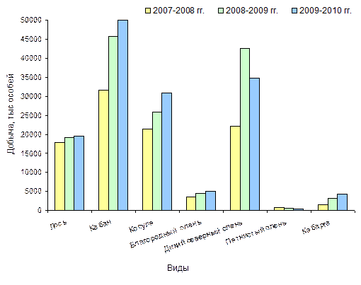 Рис. 34.3. Добыча основных охотничьих видов копытных зверей в России в сезонах охоты 2007-2008, 2008-2009, 2009-2010 гг.