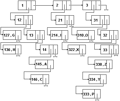 Рассмотрим еще одну задачу. На входе задана последовательность целых положительных чисел, заканчивающаяся нулем. Составить процедуру для ввода этой последовательности и организации ее последовательно-связанного индексного хранения таким образом, чтобы числа, совпадающие в двух последних цифрах, помещались в один подсписок. Выберем в качестве индексной функции G(K)=K%100+1, а в качестве индексного списка Х - массив из 100 элементов. Следующая функция решает поставленную задачу: #include #include typedef struct nd { float val; struct nd *n; } ND; int index (ND *x[100]) { ND *p; int i, j=0; float inp; for (i=0; i< 100; i++) x[i]=" NULL; " scanf(" %d", & inp); while (inp! =" 0)" { j++; p=" malloc(sizeof(ND)); " i=" inp%100+1; " p-> val=inp; p-> n=x[i]; x[i]=p; scanf(" %d", & inp); } return j; } Возвращаемым значением функции index будет число обработанных элементов списка. Для индексного списка также может использоваться индексное хранение. Пусть, например, имеется список B= с элементами K1=(338, Z), K2=(145, A), K3=(136, H), K4=(214, I), K5 =(146, C), K6=(334, Y), K7=(333, P), K8=(127, G), K9=(310, O), K10=(322, X).Требуется разделить его на семь подсписков, т.е. X= таким образом, чтобы в каждый список B1, B2,..., B7 попадали элементы, совпадающие в первой компоненте первыми двумя цифрами. Список Х, в свою очередь, будем индексировать списком индексов Y=, чтобы в каждый список Y1, Y2, Y3 попадали элементы из X, у которых в первой компоненте совпадают первые цифры. Если списки B1, B2,..., B7 хранить связанно, а списки индексов X, Y индексно, то такой способ хранения списка B называется связанно-связанным связанным индексным хранением. Графическое изображение этого хранения приведено на рис.12.