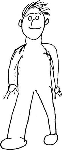Довольно часто нарушение образа тела выражается таким образом, что фигура человека, нарисованного шизоидом, выглядит клоунской. Рисунок 8 — типичный пример. Его нарисовал Пол, о котором я говорил в третьей главе. Когда я попросил Пола прокомментировать рисунок, он сказал: «Он добродушен... он, как ребенок, но он пуст. Он пытается сказать, что он не злой. Он изображает из себя дурака, чтобы люди подумали, что он глуп и одномерен. Это служит его цели. Я тоже долго играл дурака. Теперь я стараюсь быть просвещенным и философствую. Я никогда не переставал валять дурака, хотя и прибегал ко множеству ухищрений, чтобы скрыть это.» Какова его цель? Что старается скрыть клоун? Было бы вполне естественно предположить, что за маской клоуна лежит глубоко скрытая печаль и трогательная тоска. Что касается Пола, то это почти правда, ведь он пережил временную парализацию, когда попытался выразить свое страстное стремление. Я считаю, что это так и в случаях других пациентов, которые изображают из себя дураков или адаптируют роль клоуна. Однако, рисунок Пола демонстрирует еще и вытесненную ненависть, которую выражают, напоминающие шипы или